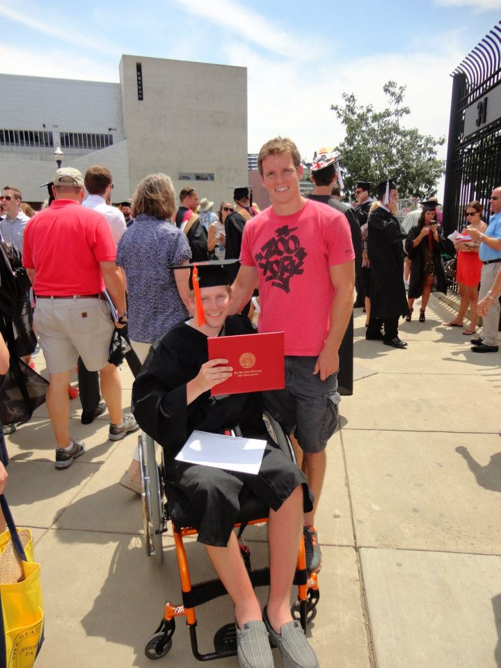 I started to become desperate and searched the web everyday for things like stem cells and electrical stimulation that would help to get people walking again. One day I came across a specific therapy for people with spinal cord injuries called locomotor training. I looked up where it was offered and was ecstatic to find that the Ohio State University Medical Center was one of 7 locations in the United States to have this therapy. I always wanted to finish my degree at Ohio State but it was not that desire that pushed me to come back to Columbus, it was the desire to walk again. So once I was accepted into therapy I knew that it would work out perfect to finish the 5 classes that I had left at the same time. But I had no idea where I would live and who would take care of me. That was when I found out about a place called Creative Living that provides housing to people with physical disabilities. It was a one-of-a-kind facility and it just so happened to be right on Ohio State’s campus. For once things were starting to work out for me and everything was falling into place. The writing that I had done Facebook had caught the attention of a girl named Brooke who contacted me as a home healthcare provider and asked me if I would need help down in Columbus. Today, her and her sister Kate both work for me and I could not ask for anyone better. They genuinely care about me and will do anything for me and they are my best friends. I’m so lucky to wake up to them every morning and to say good night to them every night. I couldn’t have it any better.
